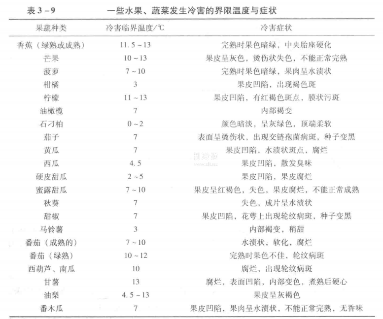 (3)冷藏溫度和冷藏時間 冷藏溫度和冷藏時間與冷害發生存在內在的相關性。水果蔬菜在低于界限溫度的環境中放置一段時間冷害才能顯現,短時間放入冷藏庫中,即使是在界限溫度以下,也不會出現低溫冷害癥狀。冷害癥狀出現最早的品種是香蕉,而黃瓜、茄子一般則需要10~14天的時間。冷害癥狀隨品種的不同而各不相同,最明顯的癥狀是表皮出現軟化斑點和核周圍肉質變色,像西瓜表面凹進、鴨梨的黑心病、馬鈴薯的發甜等。表3-9列舉了一些水果、蔬菜發生冷害的界限溫度與癥狀。