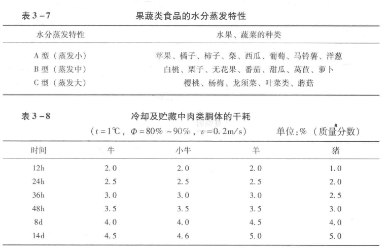 表3-7是根據水分蒸發特性對果蔬類食品進行的分類。肉類水分蒸發的量與冷卻室內的溫度、濕度及流速有密切關系,還與肉的種類、單位質量表面積的大小、表面形狀、脂肪含量等有關。動物性食品如肉類在冷卻貯藏中因水分蒸發造成的干耗情況如表3-8所示。