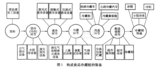 冷藏鏈主要裝備構成貫穿在整個冷藏鏈各個環節中的各種裝備、設施主要有原料前處理設備、預冷設備、速凍設備、冷藏庫、冷藏運輸設備、冷凍冷藏陳列柜(含冷藏柜)、家用冰柜、電冰箱等。如圖1所示。