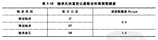 ①軸承孔的直徑公差配合和表面粗糙度要求見表3-18。