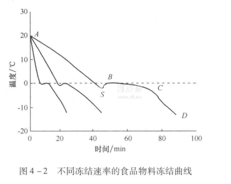 圖4-2為食品物料在不同凍結速率下的凍結曲線。圖中,A→S:冷卻過程,只除去濕熱,S為過冷點,多數樣品都有過冷現象出現,但不一定很明顯。過冷點的測定取決于測溫儀在樣品中的位置及測溫儀的敏感度。樣品組織表面的過冷程度較大,一般緩凍及測溫儀深插難測出過冷點,若過冷溫度很小或過冷時間很短,測定時需要用靈敏度很高的測溫儀才能測得。S→B:結晶放熱,溫度回升到初始凍結點B。B→C:大部分水(約3/4)在此階段凍結,需要除去大量的潛熱,BC段為有一定斜率的平衡帶,在此段的初始階段水分近乎以純水的方式形成冰結晶,后階段則有復雜的結晶物形成。C→D:由于大部分水分已凍結,此時去除一定量的熱能使樣品的溫度下降較多,樣品中仍有一些可凍結的水分。只有當溫度已達到低共熔點溫度,所有自由水分才全部凍結。表4-3反映了冰淇淋中凍結水分比例和溫度的關系。