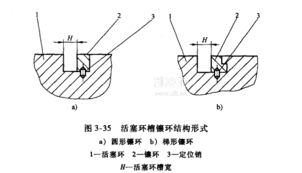①活塞環槽損傷時,可以用壤環法修復。所巖環為兩個半環,其結構形式如圖3-35所示。鑲環用的材質應同活塞體的材質相同。