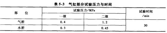 1.水壓試驗檢查排氣壓力為O.7MPa或0.8MPa的空氣壓縮機的氣缸體、缸蓋和缸座經(jīng)大修后,應按表5-3所列數(shù)據(jù)進行水壓試驗檢查。