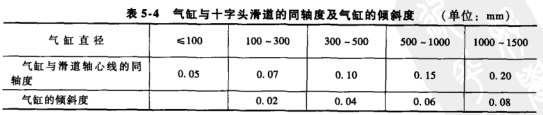 ②臥式氣缸的軸心線與十字頭滑道軸心線的同軸度、氣缸的傾斜度偏差應符合表5-4的數(shù)據(jù)。
