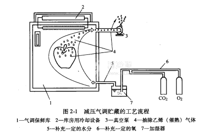 ③減壓氣調。通過真空泵將貯藏環境中一部分氣體抽出,同時將外界空氣減壓加濕后輸人,貯藏期間,抽氣和輸氣裝置連續運行,保證果蔬貯藏在一個低壓環境中。它不同于常規改變氣體成分的氣調方式,因為它不通過降低氧含量來形成低氧環境,而是靠降低氣體密度來產生低氧環境。雖然降氧方式不同,但降氧效果是相同的,只要控制和調節貯藏環境的真空度,就可以得到不同的低氧含量。
