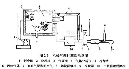 由反應式可見,空氣中的氮氣不參與反應,式中的水蒸氣可通過冷凝的方法排除,反應后的無氧氣體再返回貯藏環境中,如此循環,直至將貯藏環境中的含氧量降到要求值。但是,這種燃燒降氧的方法及果蔬的呼吸作用,會使貯藏環境中二氧化碳含量升高,這時可以結合使用二氧化碳脫除機降低二氧化碳含量,以免造成果蔬中毒。這種氣調方式在機械氣調貯藏庫中使用,圖2-3是機械氣調貯:藏庫示意圖。