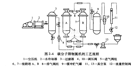 碳分子篩制氮機的工藝流程見圖24.其工作過程如下:大氣或庫內氣體由空壓機1的進口吸人,壓縮后往水冷卻器2冷卻、過濾器3過濾掉水和油,往調壓閥4將氣體壓力降至0.3MPa,然后通過進氣閥組5,在吸附塔A或B進行吸附分離,碳分子篩將氧吸附,而富氮氣體經排氣閥組8,進入級沖貯氣罐9,再經調壓閥10誠壓,送回氣調庫。同時,另一塔脫附,由真空泵11減壓,吸附在碳分子篩上的氧氣被脫附下來,排放到大氣中去。如此兩塔交替工作,可連續獲得低氧高氨氣體供給氣調庫降氧。