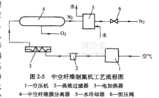 中空纖維制氮機的工藝流程圖見圖2-5.其工作過程如下:空壓機1將氣調庫內氣體升壓后,送人高效過濾器2進行除水、油、雜質,以免中空纖維管堵塞,影響分離效果,然后通過電加熱器3,其作用是保證膜良好的滲透系數和分離系數所要求的溫度,防止進人分離器的空氣中殘留的水分結霹影響分離效果。加熱溫度