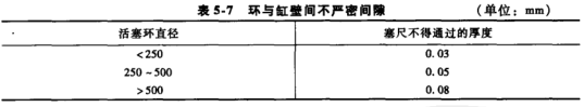 1.活塞環(huán)的安裝1)檢查活塞環(huán)外圓工作表面與缸壁間的不嚴密間隙。間隙值如表5-7所示。
