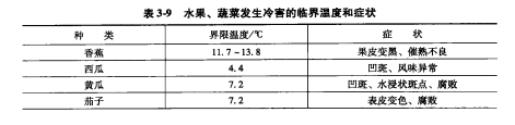 冷害癥狀隨品種的不同而各不相同,最明顯的癥狀是表皮出現軟化斑點和核周圍肉質變色,如黃瓜表面凹斑、鴨梨的黑心病等。表39列舉了一些水果、蔬菜發生冷害的臨界溫度和癥狀。