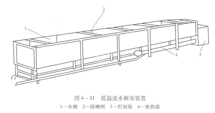 (2)低溫流水解凍 流水解凍是將凍品浸沒(méi)于流動(dòng)的低溫水中進(jìn)行解凍。解凍時(shí)間由水溫、水的流速?zèng)Q定。流水解凍裝置是分批式流水浸漬型的,槽兩端處設(shè)有除鱗網(wǎng),槽底一端裝有攪拌器,可正反轉(zhuǎn)。槽可長(zhǎng)可短,根據(jù)解凍量的多少,可以數(shù)個(gè)槽連在一起,也可以分開(kāi)使用。槽內(nèi)水通過(guò)熱交換器保持一定的溫度。空載時(shí)槽內(nèi)水流速為0.25m/s,攪拌器每5min換向運(yùn)轉(zhuǎn)一次,以改變槽內(nèi)水流動(dòng)的方向。水溫由換熱器保持在5~12℃,解凍時(shí)間一般為80~90mim。圖4-31為低溫流水解凍裝置。