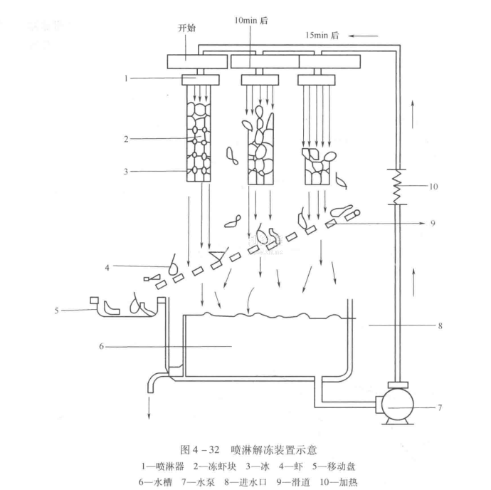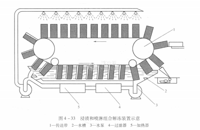 (3)噴淋解凍噴淋解凍是將凍結(jié)食品放在傳送帶上,用蒸汽將水加熱至18~20℃,然后用水泵將水輸送到噴淋裝置上向速凍食品噴淋解凍。水可以循環(huán)使用,但需有過(guò)濾器、凈水器以保持衛(wèi)生。圖4-32為噴淋解凍裝置示意圖。