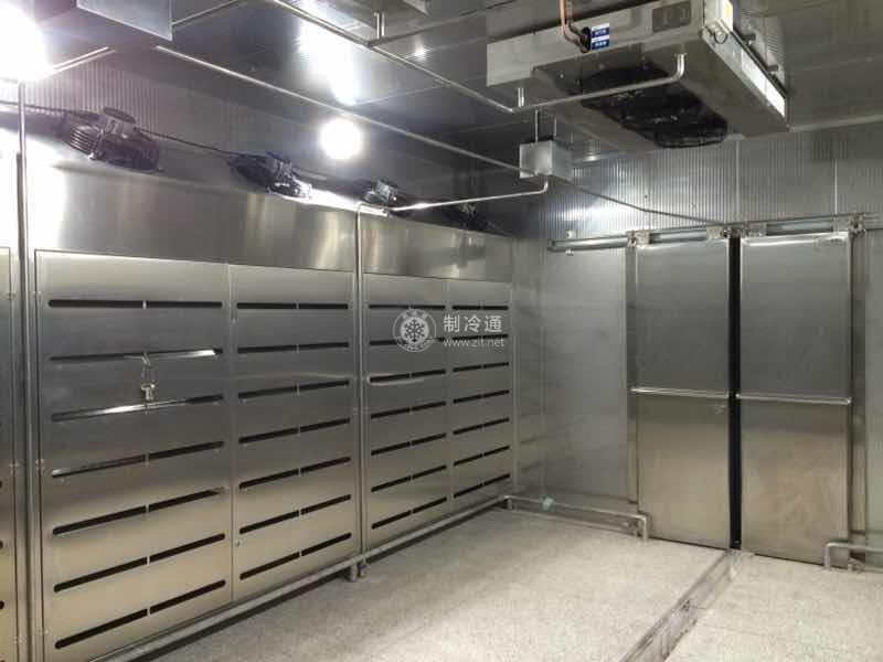 這種凍結(jié)設(shè)備在肉類加工業(yè)中應(yīng)用較為廣泛,主要是在凍結(jié)間內(nèi)裝設(shè)落地式干式冷風(fēng)機(jī),也有采用吊頂式冷風(fēng)機(jī)的。