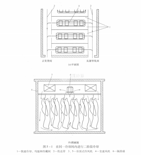 在同一冷卻間內進行二階段冷卻如圖5-1所示。首先將冷卻間內溫度降至-15~-10℃,然后進貨,進貨過程中,變速風機停開或降低轉速,使溫度上升到-5℃;進貨結束后,立即用強烈的空氣冷卻,經2~3h庫溫降至-10℃,這時肉胴體表面溫度為0℃左右,肉中心溫度約為20℃:關閉風機后胴體仍掛在冷卻間內,經過12~13h肉體溫度均衡到4℃,即在進貨后16h,肉胴體中心溫度降到4℃,這樣可以在次日早晨出庫,也可以繼續存放在冷卻間內。這種冷卻系統的主要缺點是每一個冷卻間需要安裝相當大的蒸發器(冷風機)。一般每噸進貨量需要60m的蒸發器面積,且熱負荷的不平均系數較大。為克服這一缺點,可采用中央強烈通風系統,如圖5-2所示。