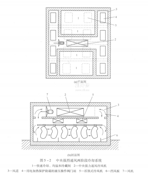 中央強烈通風系統的冷風機安裝在冷卻間的上部,作為第一階段冷卻用,而安裝在冷卻間天花板頂部的若干個小型冷風機用于第二階段冷卻和在進一步貯藏中維持冷卻間所需的制冷量。