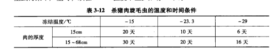 1,生物生物是指小生物,如昆蟲、寄生蟲之類,經過凍結都會死亡。牛肉、豬肉中寄生的無鉤緣蟲、有鉤緣蟲等的胞囊在凍結時都會死亡。豬肉中的旋毛蟲的幼蟲在-15℃下20天后死亡。大馬哈魚中的裂頭絳蟲的幼蟲在-15℃下5天后死亡。由于凍結對肉類所帶有的寄生蟲有殺死作用,有些國家對肉的凍結狀態作出規定,如美國對凍結豬肉殺死肉中旋毛蟲的幼蟲規定了溫度和時間條件,見表3-12,聯合國糧農組織(FAO)和世界衛生組織(WHO)共同建議,肉類寄生蟲污染不嚴重時,須在一10℃溫度下至少貯存10天。