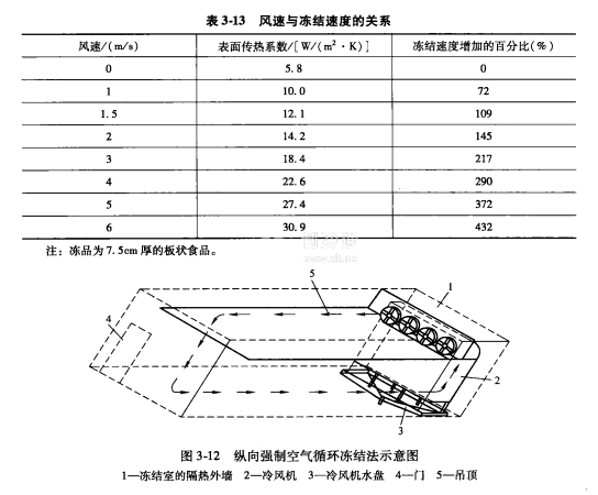鼓風(fēng)式凍結(jié)用空氣作冷卻介質(zhì)強(qiáng)制循環(huán)對(duì)食品進(jìn)行凍結(jié)是目前應(yīng)用最廣泛的一種凍結(jié)方法。由于空氣的表面?zhèn)鳠嵯禂?shù)較小,在空氣自然循環(huán)中凍結(jié)的速度很慢,故工業(yè)生產(chǎn)中已不大采用。增大風(fēng)速,能使凍品表面?zhèn)鳠嵯禂?shù)增大,這樣凍結(jié)速度可加快。風(fēng)速與凍結(jié)速度的關(guān)系見表313.縱向強(qiáng)制空氣循環(huán)凍結(jié)法見圖312。