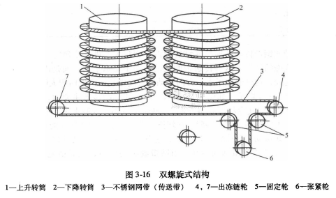 圖315為單螺旋式結(jié)構(gòu),若不銹鋼網(wǎng)帶(傳送帶)很長,凍結(jié)裝置將很高、操作不方便,并且凍品出凍時(shí),容易造成機(jī)械損傷。因而開發(fā)出了圖3-16所示的雙螺旋式結(jié)構(gòu),使凍品進(jìn)、出時(shí),均處于相同水平位置,避免了上述缺點(diǎn)。