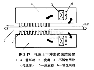氣流上下沖擊式凍結裝置如圖3-17所示,它是連續式隧道凍結裝置的一種最新形式,因其在氣流組織上的特點而得名。在這種凍結裝置中,由空氣冷卻器吹出的高速冷空氣分別進人上、下兩個靜壓箱,在靜壓箱內,氣流速度降低,由動壓轉變為靜壓,并在出口處裝有許多噴嘴,氣流經噴嘴后,又產生高速氣流(流速在30m/s左右)。此