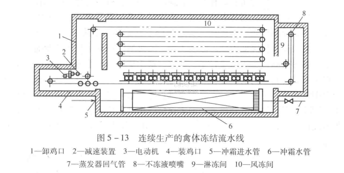 不凍液噴淋與吹風式相結合的凍結工藝主要分為三個部分:第一部分,為了保持禽體本色,袋裝的禽胴體進入凍結室后,首先用-28℃的強冷風吹10多分鐘,使禽體表面快速冷卻,起到色澤固定的作用。第二部分,用-25~-24℃的乙醇溶液(濃度40%~50%)噴淋5~6min,使禽體表面層快速凍結,不僅使家禽外表呈現乳白或微黃的明亮色調,使制品色澤美觀,還可加快凍結周期。第三部分,在凍結間內用-28℃空氣吹風凍結2.5~3h。三個部分形成了一條適應大量而且連續生產的禽體凍結流水線,如圖5-13所示