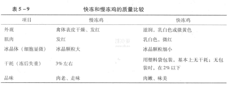 總之,快速凍結的禽類,不僅制品外觀色澤佳,而且內在質量好,商品干耗大大降低??靸雠c慢凍雞的質量比較情況見表5-9。