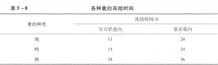 凍結(jié)禽時,凍結(jié)間的溫度一般為-25℃或更低些,相對濕度在85%~90%,空氣流動速度為2~3/s。凍結(jié)的時間在相同的條件下,與禽的種類及采用的方法有關(guān),一般是雞比鴨、鵝等快些,在鐵盤內(nèi)比在木箱內(nèi)或紙箱中快些。各種禽在采用不同的凍結(jié)方法時的凍結(jié)時間如表5-8所示。各種禽凍結(jié)終了時的胴體溫度,一般在肌肉最厚部位處達到-10℃即可。