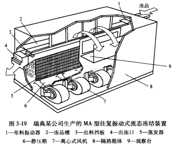 圖3-19為瑞典某公司生產(chǎn)的MA型往復振動式流態(tài)凍結裝置。它具有氣流脈動機構,由電動機帶動的旋轉式風門組成,按一定的速度旋轉,使通過流化床和蒸發(fā)器的氣流流量不斷增減,攪動被凍食品層,從而可以更有效地凍結各種軟嫩和易碎食品。風門的旋轉速度是可調(diào)的,可調(diào)節(jié)至各種被凍食品的最佳脈動旁通氣流量。