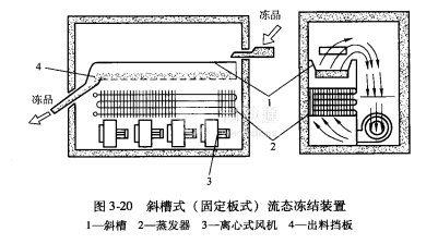 斜槽式(固定板式)流態凍結裝置。這種凍結裝置如圖3-20所示,其特點是無傳送帶或振動篩等
