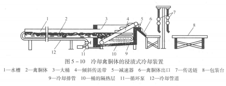 (1)浸漬冷卻 浸漬冷卻是指用冷卻水或冰水混合物進行的冷卻,限用飲用水。優點是:具有漂白效果,產品的表面呈白色:冷卻速度快,易實現流水作業,沒有干耗,而且會增重。缺點是:微生物污染增加,禽胴體帶水量多,如仔雞平均增重5.5%~12%,在個別情況下增重高達30%之多;包裝后袋內易滲出水分且逐漸增加,影響產品的外觀,并為微生物的生長繁殖創造了條件。