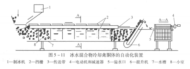 冰水混合物冷卻禽胴體的自動化裝置見圖5-11。這種裝置由水槽、帶有擋柵的傳送帶、提升機、電動機和減速器組成。制冰機單獨安裝。該裝置應用較為廣泛。