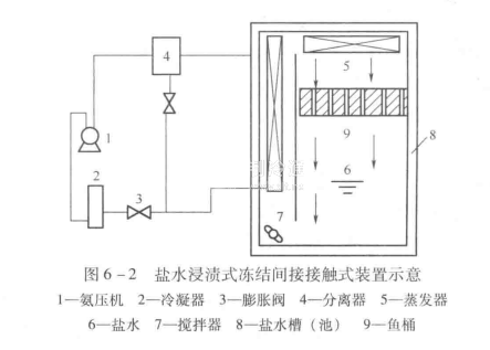 (2)間接接觸凍結(jié)所用的鹽水是氯化鈣水溶液,通過攪拌器的強(qiáng)制作用,鹽水在池內(nèi)不斷循環(huán)流動(dòng),并經(jīng)過蒸發(fā)器冷卻,從而使池內(nèi)鹽水均處于低溫狀態(tài),如圖6-2所示。被凍的魚貨經(jīng)清洗后裝入桶內(nèi),并浸于鹽水池中進(jìn)行凍結(jié)。此法優(yōu)點(diǎn)是凍結(jié)速度比空氣凍結(jié)快,又避免了鹽分滲入魚體。缺點(diǎn)是與鹽水接觸的所有容器、設(shè)備都會(huì)受到腐蝕。