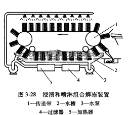將水噴淋和浸漬兩種解凍形式結(jié)合在一起,以提高解凍速度,提高解凍品的質(zhì)量。圖3-28為浸漬和噴淋組合解凍裝置。魚塊