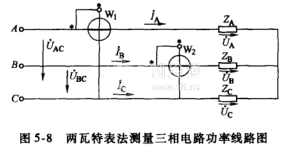 (不管三相電路是否對稱)電路的功率時,應用兩瓦特表法(不適用于三相四線制不對稱電路)。兩瓦特表法測量三相電路功率的線路如圖5-8所示。