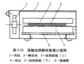 其他解凍方法1.接觸加熱解凍這是將冷凍食品與傳熱性能優良的鋁板緊密接觸,鋁制中空水平板中流動著溫水,凍品夾在上下水平鋁板間解凍。接觸加熱解凍裝置的結構與接觸凍結裝置相似,中空鋁板與凍品接觸的另一側帶有肋片,以增大傳熱面積,裝置中還設有風機。該裝置如圖3-33所示。