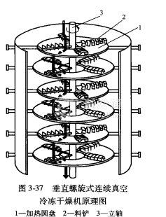 在垂直螺旋式連續真空冷凍干燥機中,加熱圓盤大小錯開垂直布置,這種裝置主要用于顆粒狀食品的冷凍干燥。已經凍結好的顆粒狀食品從上部落入頂部加熱圓盤,干燥室中央立軸上裝有帶料鏟的攪拌臂,立軸旋轉時,料鏟攪動食品從圓盤外緣落入下一小圓盤,在這一加熱圓盤上,料鏟迫使食品從圓盤中心落人第三塊加熱盤,這塊圓盤直徑與第一塊相同,物料如此逐盤落下,直至出料口。食品從頂部落人,到底部排出的運動軌跡,實際是一條螺旋線。