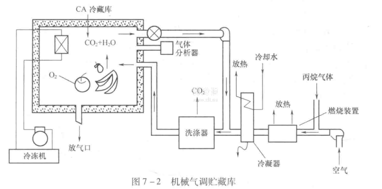 該方法是使用氣體反應器,通過對丙烷氣體的完全燃燒來減少氧氣和增加二氧化碳含量的。當氣體發(fā)生器制出果蔬最適宜氣體組成后,就把這種氣體送入冷庫中,這樣的冷庫稱作機械氣調(diào)貯藏庫,圖7-2為機械氣調(diào)貯藏庫的示意圖。