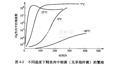 低溫細菌的繁殖在0℃以下變得緩慢,但如果要它們停止繁殖,一般來說溫度要降到-10℃以下,個別低溫細菌在-40℃的低溫下仍有繁殖現象。圖4-2所示是隨著品溫變化鱈魚肉上低溫細菌(無芽孢桿菌)的繁殖情況。