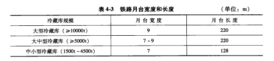 @月臺(tái)。供裝御貨物之用。為適應(yīng)裝卸作業(yè),有鐵路月臺(tái),汽車月臺(tái)和聯(lián)系月臺(tái)之分。大中型冷庫(kù)的鐵路月臺(tái),應(yīng)視機(jī)械保溫列車的長(zhǎng)度或車輛節(jié)數(shù)而定,一般有128m、220m等不同長(zhǎng)度,月臺(tái)寬度和長(zhǎng)度具體見(jiàn)表43,鐵路月臺(tái)應(yīng)高于鋼軌面1.1m。汽車月臺(tái)的長(zhǎng)度按冷庫(kù)的類型、貨物吞吐量和運(yùn)輸方式確定。