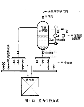 重力供液在節流機構之后,高于蒸發器的位置設置氣液分離器,使節流后的低壓液態制冷劑首先進入液體分離器,并控制分離器內的液位一定,利用該液位與蒸發器之間的高度差所形成的靜液柱,作為向蒸發器供液的動力,即為重力供液方式,如圖4-13所示。