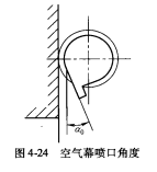 空氣幕的作用是減少庫(kù)內(nèi)外熱濕交換,方便裝卸作業(yè)。空氣幕噴口厚度一定時(shí),其工作效率與憐庫(kù)門高度H、庫(kù)內(nèi)外溫差△:,噴射角度a,和噴口出風(fēng)速度有關(guān)。當(dāng)H和△t一定時(shí),空氣幕的效率即主要取決于和。空氣幕噴口角度見圖424.空氣幕噴口傾斜角選釋見表4-21。