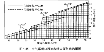 空氣幕噴口風(fēng)速一般取平均風(fēng)速15m/s左右。在不同噴口傾斜角條件下,噴口最佳風(fēng)速可按圖425選取。