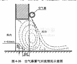 另外,空氣幕風(fēng)口最佳風(fēng)速,還可通過門洞霧氣回流最小回流區(qū)及其風(fēng)速來(lái)確定,見圖4-26.通常霧氣最好限制在門框厚度范圍內(nèi)回旋,或用風(fēng)速儀測(cè)定距門框邊400mm,距地面100mm處A點(diǎn)的霧氣回流速度,將其控制在0.6m/s左右。