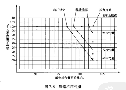 如果用戶用氣量在較長時間里小于60%的額定氣量,壓縮機的經濟性下降,致使壓力開關控制氣缸電磁閥,卸載閥頻繁動作,電動機頻繁地受到沖擊,影響各元件的壽命。所以在選擇壓縮機時,一定要與系統用氣量相匹配,使其在壓縮機適合的工作范圍內(圖7-6)。