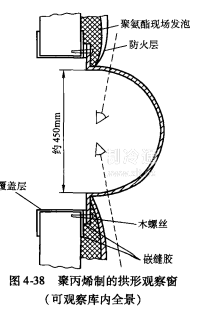 觀察窗一般為500mm×500mm雙層玻璃真空透明窗,也有便于擴大視野的直徑500mm半球形窗,邊緣應有防結霧電熱絲。一般用聚丙烯制作成拱形,可以擴大觀察視線,如圖4-38所示。我國通常將其設置在靠技術走廊的氣調庫外墻上,如無技術走廊,可設置扶梯登