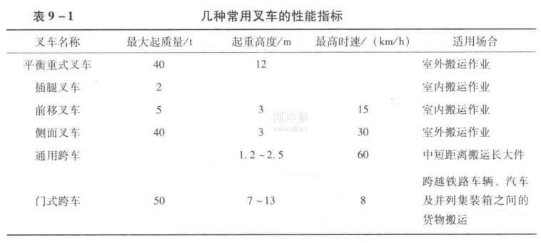 叉車(forklift truck)是一種具有各種叉具,能夠?qū)ω浳镞M行升降和移動以及裝卸作業(yè)的搬運車輛。叉車的功能強大,使用非常方便,它可用來提取、搬運、堆碼冷藏品,能夠完成成件貨物的出庫、搬運、裝卸、人棧4種復(fù)合作業(yè)。叉車的功能擴展也相當(dāng)容易。當(dāng)配備多種附屬機構(gòu)裝置時,叉車還能用于散裝貨物的裝卸和搬運。叉車又稱鏟車或叉式取貨機,它是以貨叉作為主要取貨裝置,依靠液壓起升機構(gòu)升降貨物,由輪胎式行駛系統(tǒng)來實現(xiàn)貨物的水平搬運,具有裝卸和搬運的雙重功能。表9-1為幾種常用叉車的性能指標(biāo)等數(shù)據(jù)的比較。