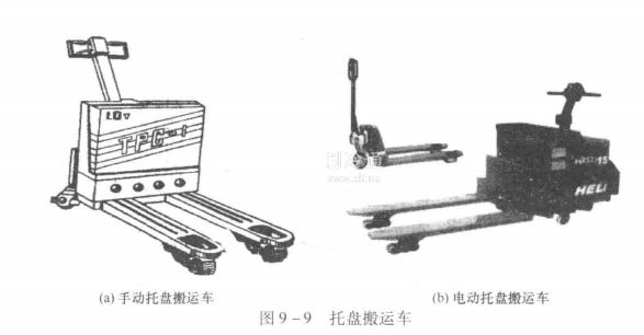 托盤搬運車又稱托盤式叉車,它是以搬運托盤為主的搬運車輛。它包括手動托盤搬運車和電動托盤搬運車,適合用于冷庫區(qū)域內(nèi)間距及高度不大的車間之間的冷藏品搬運。要求行駛路面堅硬平整,如圖9-9(a)、圖9-9(b)所示托盤搬運車的優(yōu)點是體型小,質(zhì)量輕,操作維修方便:插腿的前端有兩個小直徑的行走輪,用來支承托盤貨物的質(zhì)量。