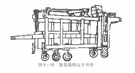 如圖9-10所示,集裝箱跨運車的門形車架跨在集裝箱上,由裝有集裝箱吊具的升降系統(tǒng)吊起集裝箱,進行搬運,且可將集裝箱堆垛達(dá)四五層高。集裝箱跨運車由發(fā)動機、底盤(傳送系統(tǒng)、支承行走系統(tǒng)、制動系統(tǒng)、轉(zhuǎn)向系統(tǒng))及工作裝置三大部分組成。有的跨運車走行輪可同時轉(zhuǎn)向,這樣在貨場有限的空地上有很大的靈活性。