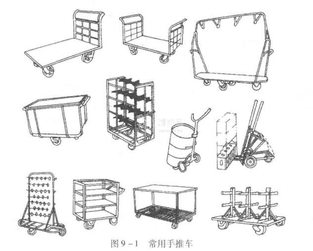 手推車是一種以人力為主、在路面上從事水平運輸的搬運車。它的特點是輕巧靈活,易操作,回轉半徑小,廣泛地應用于廠內、車間、倉庫、貨場、站臺等處,是短距離運輸較小物品的一種方便且經濟的運輸工具。圖9-1所示為常用手推車。