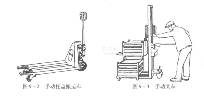 圖9-2為手動托盤搬運車,它用于搬運裝載與托盤貨托架上的冷藏品。當貨叉插入托盤或托架后,上下搖動手柄,使液壓千斤頂提升貨叉,托盤或托架就隨之離地。當物品運到目的地后,踩動踏板,貨叉落下,放下托盤或托架。該搬運車適合于短距離的水平搬運作業,它靈活、輕便。圖9-3為手動叉車,它是一種利用人力提升貨叉的裝卸、堆垛和搬運多用車,適合用于工廠車間、冷庫內需要一定起升高度的搬運作業。