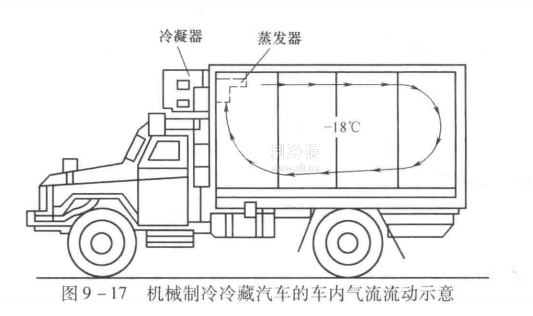 空氣冷卻器通常安裝在車廂前端,采用強制通風方式。冷風貼著車廂頂部向后流動,從兩側及車廂后部下到車廂底面,沿底面間隙返回車廂前端。這種通風方式使整個食品貨堆都被冷空氣包圍著,外界傳入車廂的熱流直接被冷風吸收,不會影響食品的溫度。為了形成上述冷風循環,食品要堆放在木板條上,在貨垛的頂部與四圍留有一定的間隙,作為冷空氣循環通路。圖9-17為機械制冷冷藏汽車的車內氣流流動示意。
